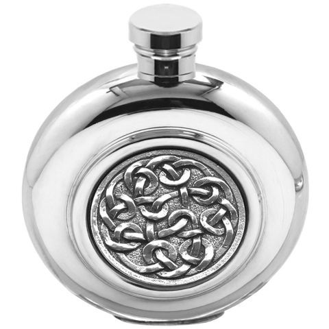 This round Piper Pewter Hip Flask is finished with a celtic design on the front of the hip flask.