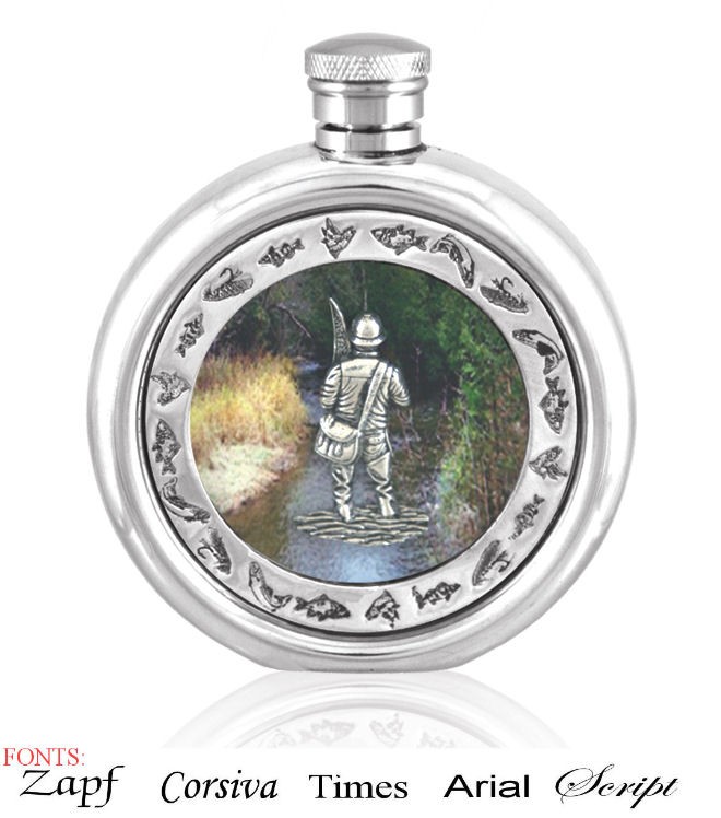 This superior quality hand made 6oz Hip Flask is made in English Pewter and features an encapsulated Pewter Fly Fisherman scene set behind glass. It will arrive in a gift box to make it perfect.