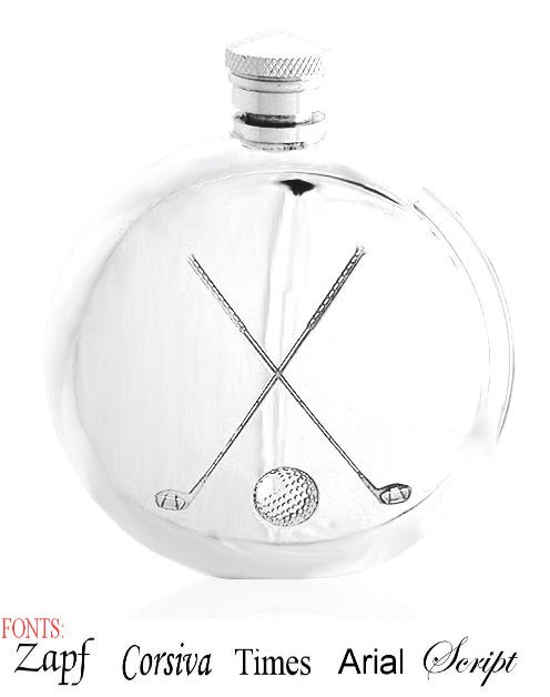 This 6oz Round Crossed Golf Clubs English Pewter Hip Flask is of superior quality. It is hand made In England Pewter meaning that no hip flask is the same. We can personalise the hip flask on the back free of charge and it comes in its own silk lined gift box with a stainless steel filling funnel.